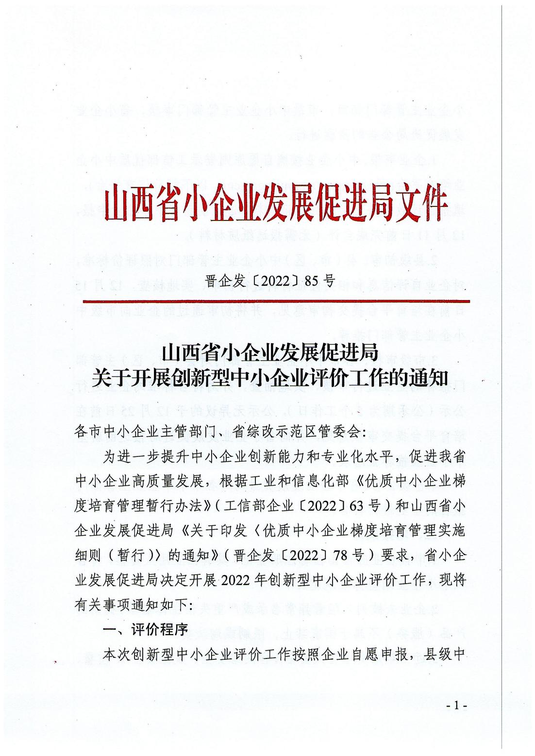 關(guān)于開展創(chuàng)新型中小企業(yè)評價工作的通知-晉企發(fā)【2022】85號